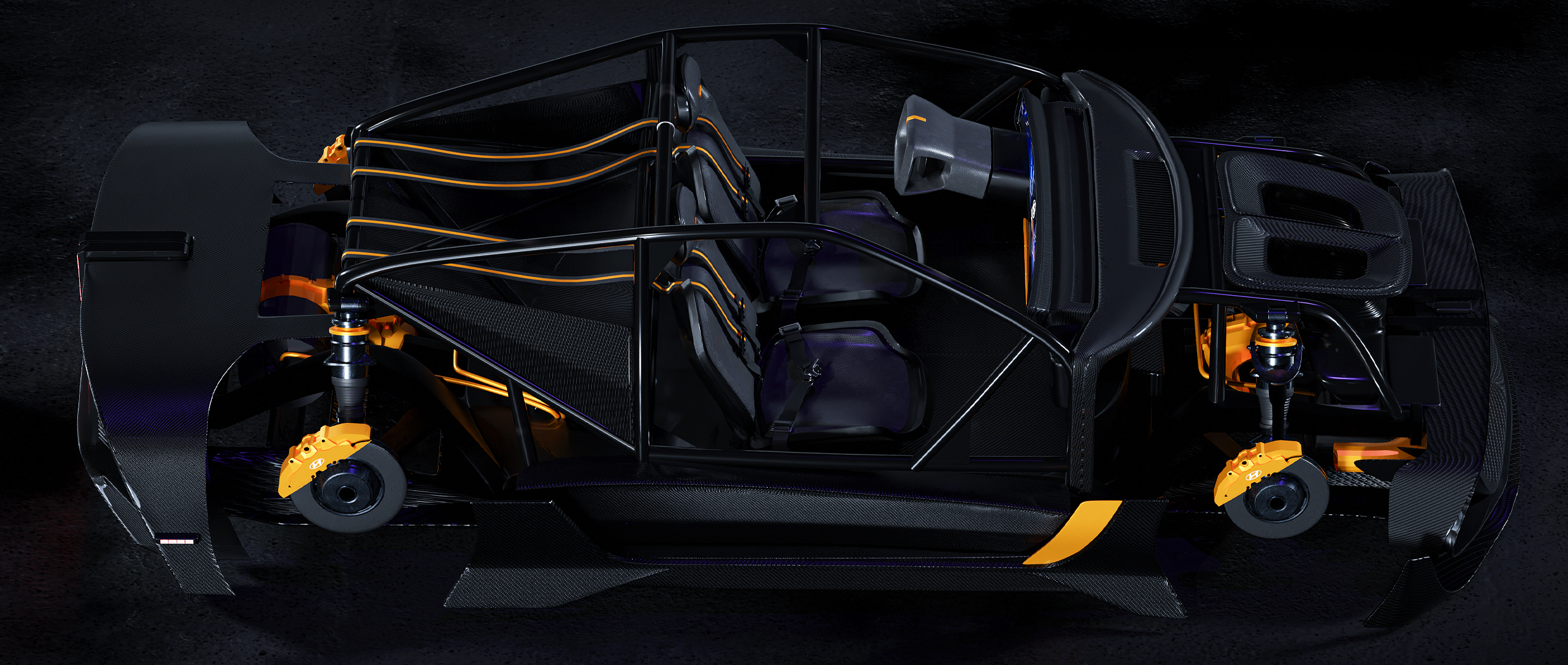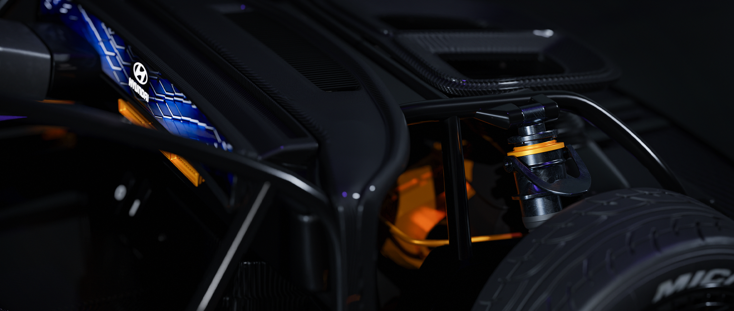 Designed as a lightweight, track-oriented EV sports car, this concept focuses on minimizing mass while managing the thermal demands of a high-performance electric drivetrain. Carbon-intensive body sections and a pared-back, functional stance support the “light first” philosophy, while multiple intakes and airflow paths are integrated to feed battery and motor cooling without compromising the silhouette. A short wheelbase reinforces agility and rotation, and the dual-motor AWD layout improves traction, stability, and overall balance—supporting a controlled weight distribution and confident corner-exit performance.