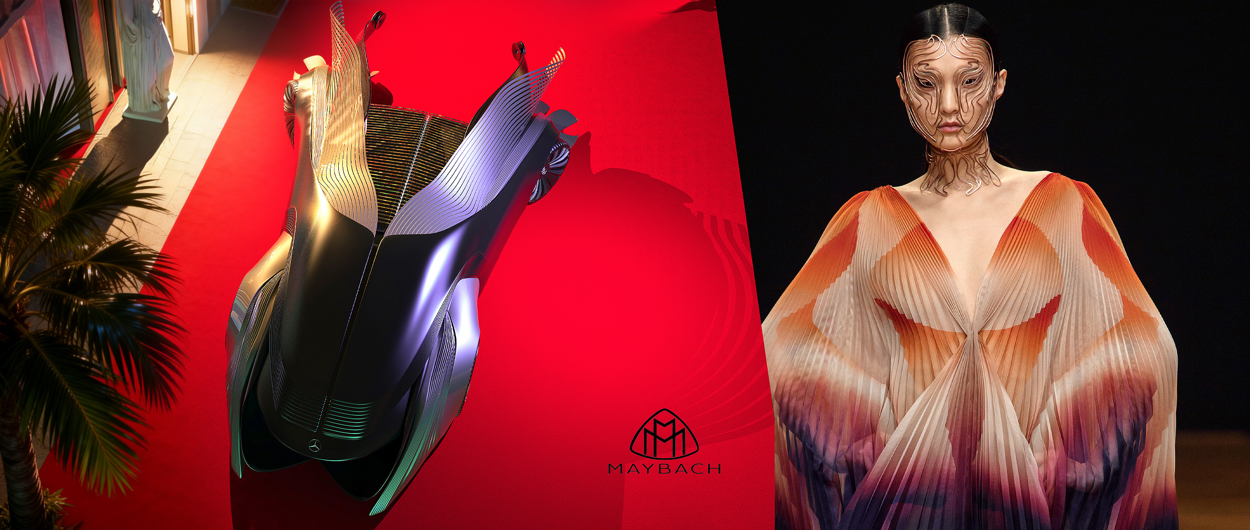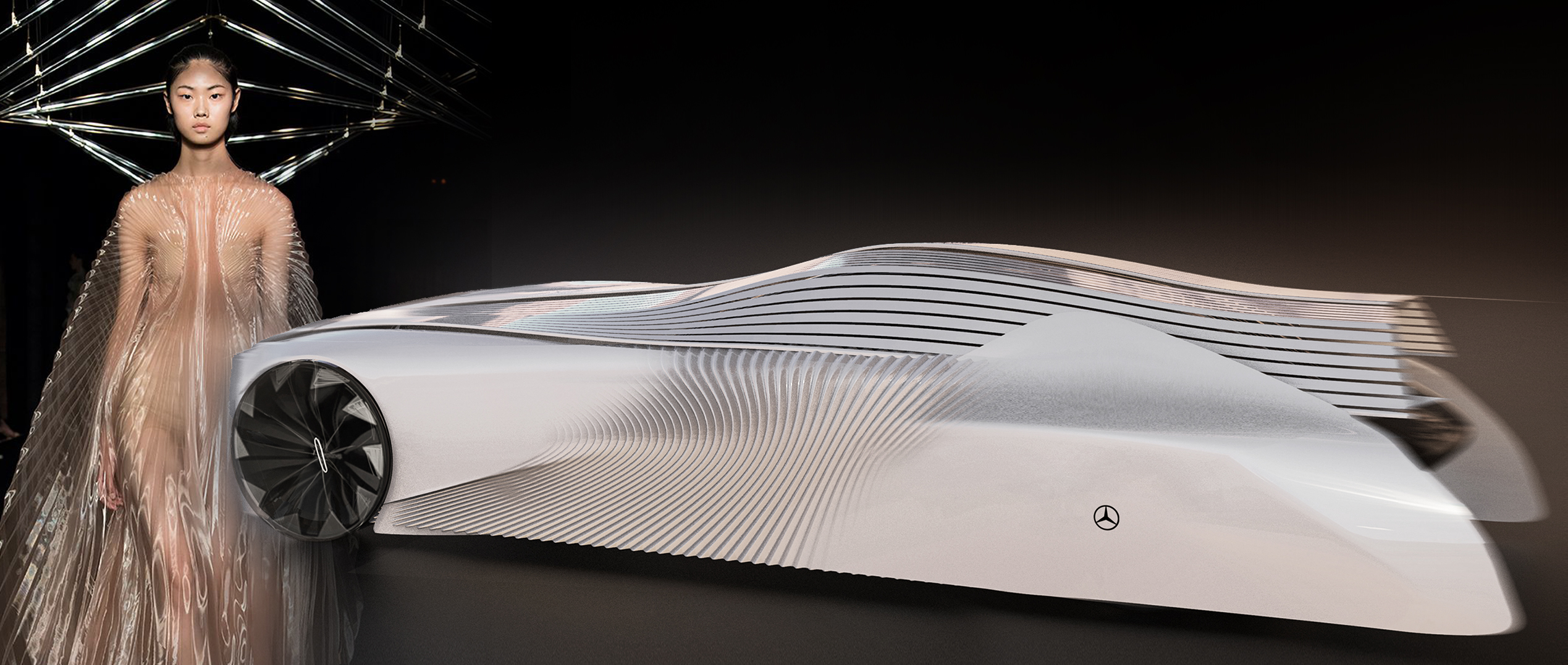 This concept explores Mercedes-Benz luxury through the lens of haute couture—where engineering becomes performance. I chose Iris van Herpen because her work sits exactly at the intersection of craftsmanship and experimentation: sculptural silhouettes, material innovation, and a strong sense of motion captured as form. That alignment makes her a credible partner for Mercedes-Benz—both brands treat design as precision, not decoration, and both use advanced techniques to create elegance with intention.