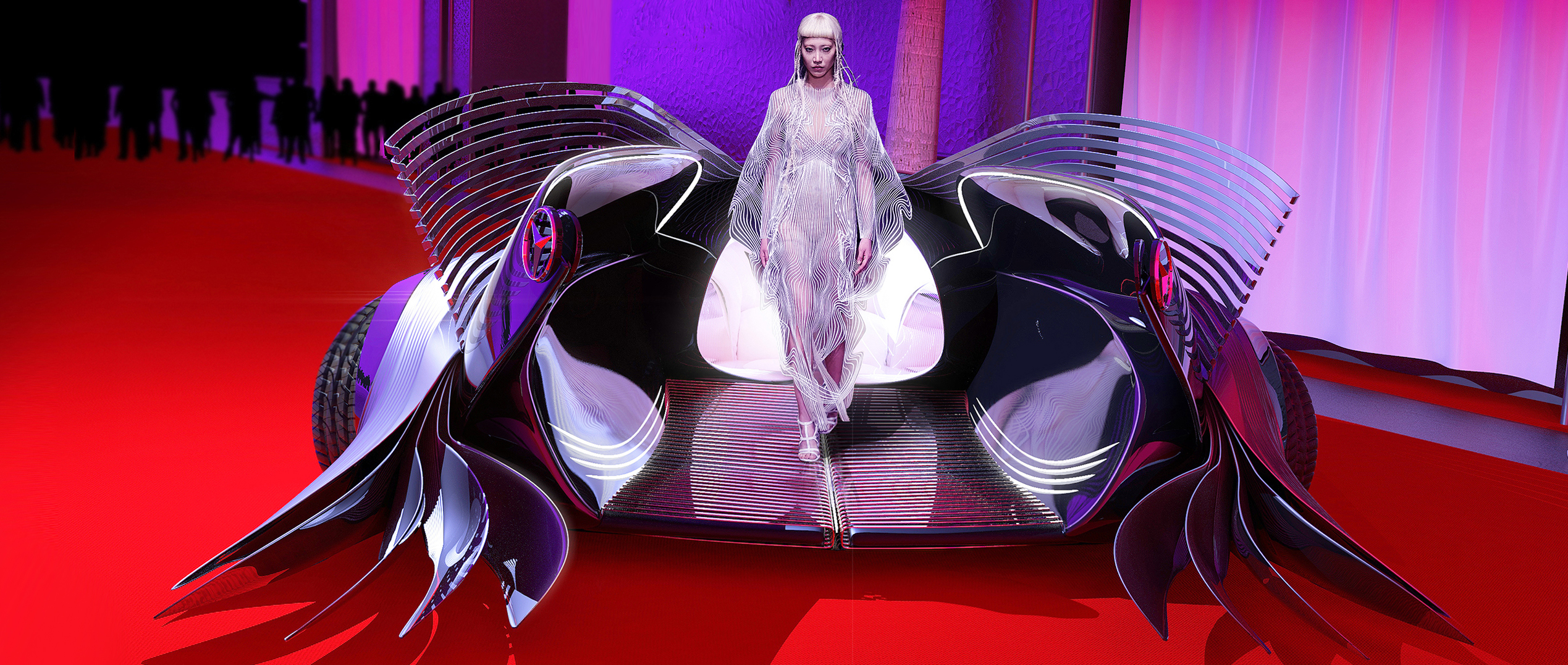 The vehicle is designed as an arrival ritual for the Met Gala: it doesn’t just “open,” it unfolds like couture. The body panels separate and lift in layered arcs—echoing pleated, ribbed, and wave-like structures from van Herpen’s dresses—so the car becomes a stage that frames the passenger. Light, reflection, and shadow are treated as active materials: glossy surfaces, translucent elements, and fine structural lines amplify motion even when the car is standing still.
