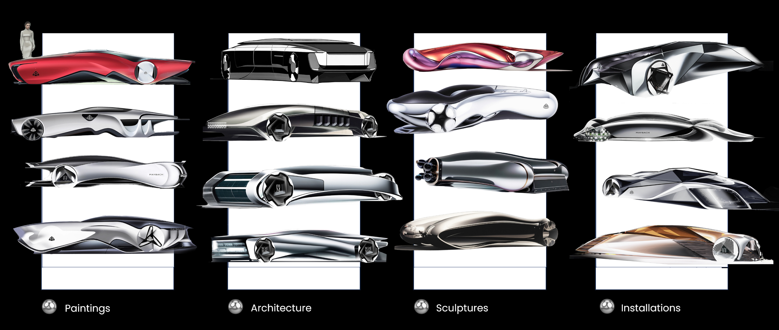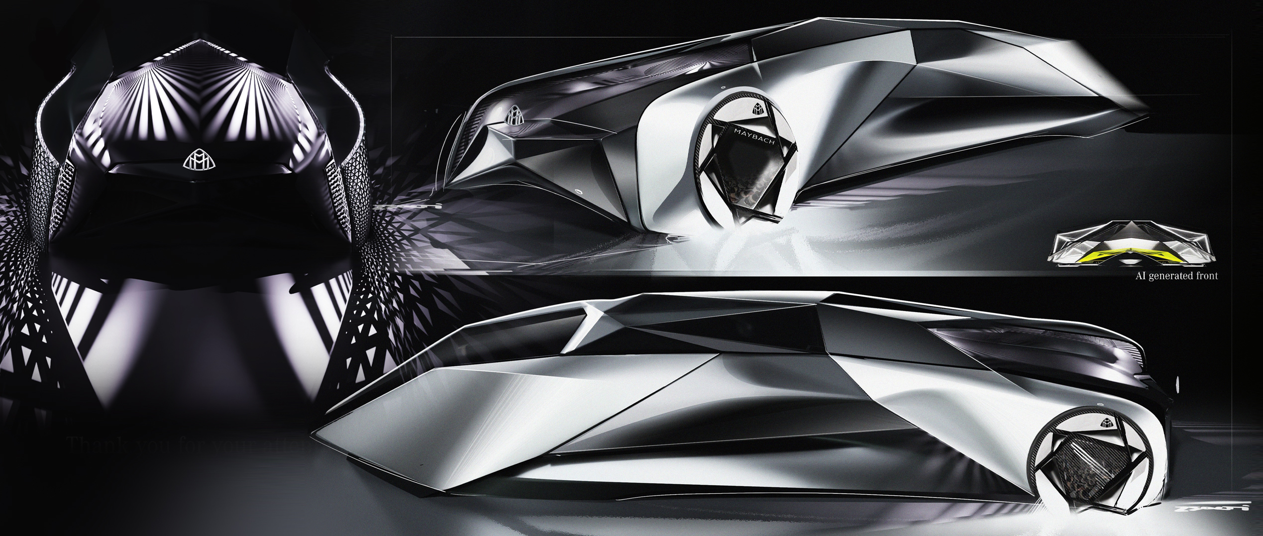 This project investigates how AI can be integrated into the early design process as a catalyst for creating a new Mercedes-Maybach form language. Instead of using AI to “finish” a design, I used it to expand visual thinking—cross-combining contemporary art, architecture, installations, and sculpture to generate abstract automotive cues that could be translated into real surfacing decisions. The objective was not to create a vehicle “inspired by” art in a superficial sense, but to extract a new design language from it. AI served as a generator of visual hypotheses—allowing me to fuse multiple art references, test variations, and isolate recurring formal rules.