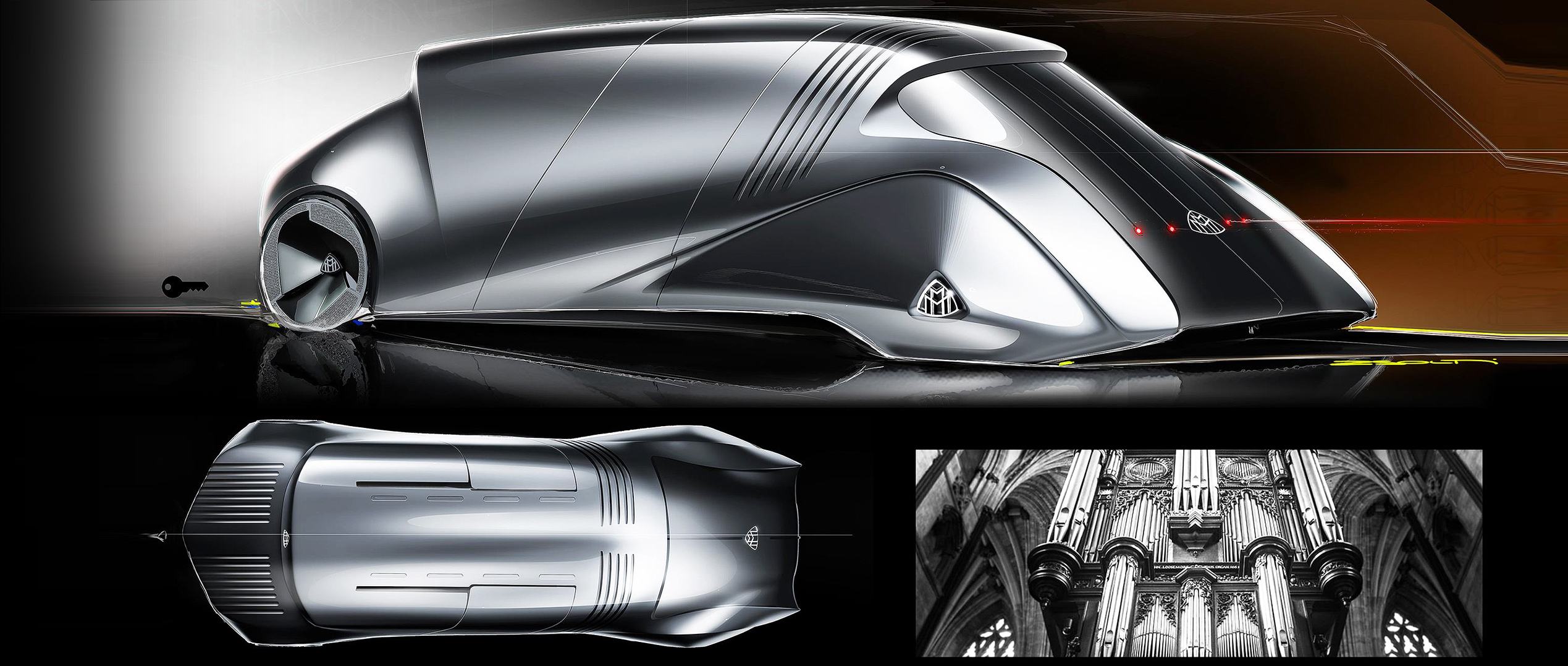 After testing multiple instrument families, the project converged on the pipe organ as the final reference system. Its architectural presence, vertical rhythm, and modular repetition translate naturally into Maybach—calm authority, ceremonial proportion, and controlled detail density. The organ became a concrete framework for front architecture, surfacing rhythm, and signature lighting logic.